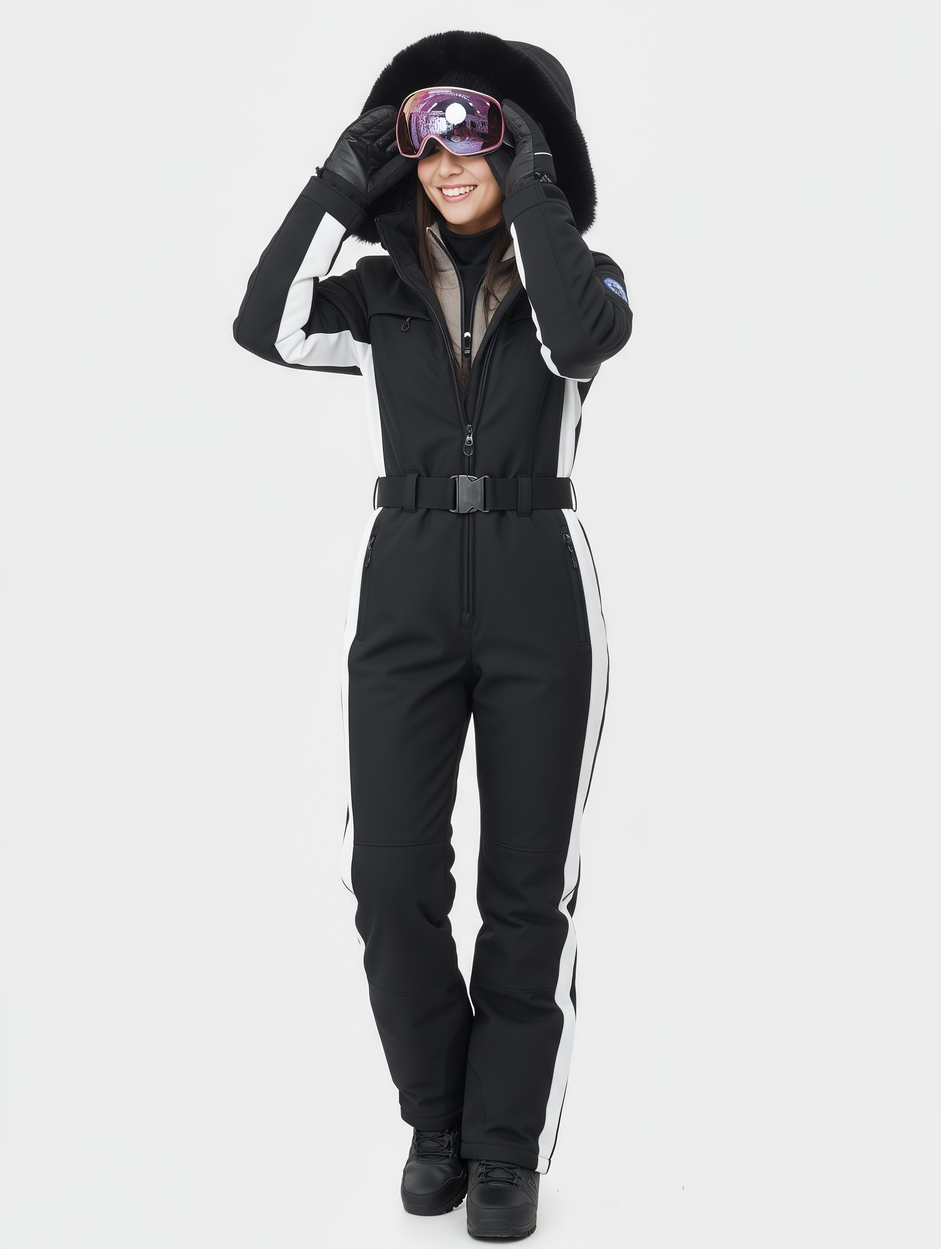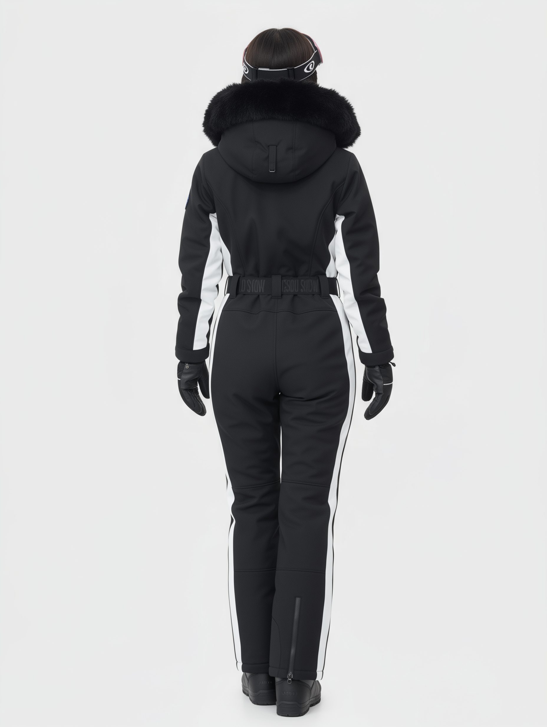 ชุดสกีสีดำตัดขาวทรงเข้ารูป กันลมมีฮู้ดเฟอร์