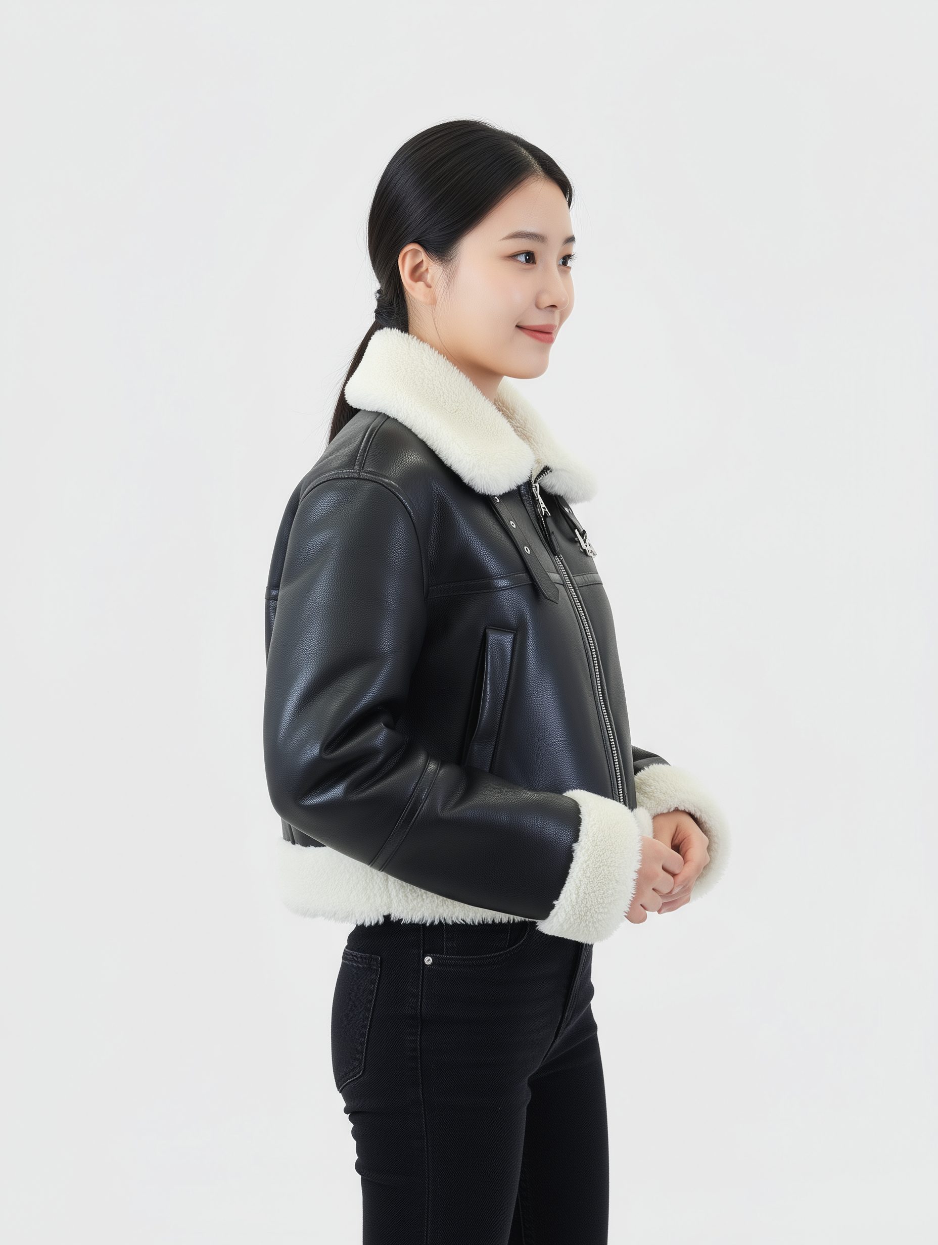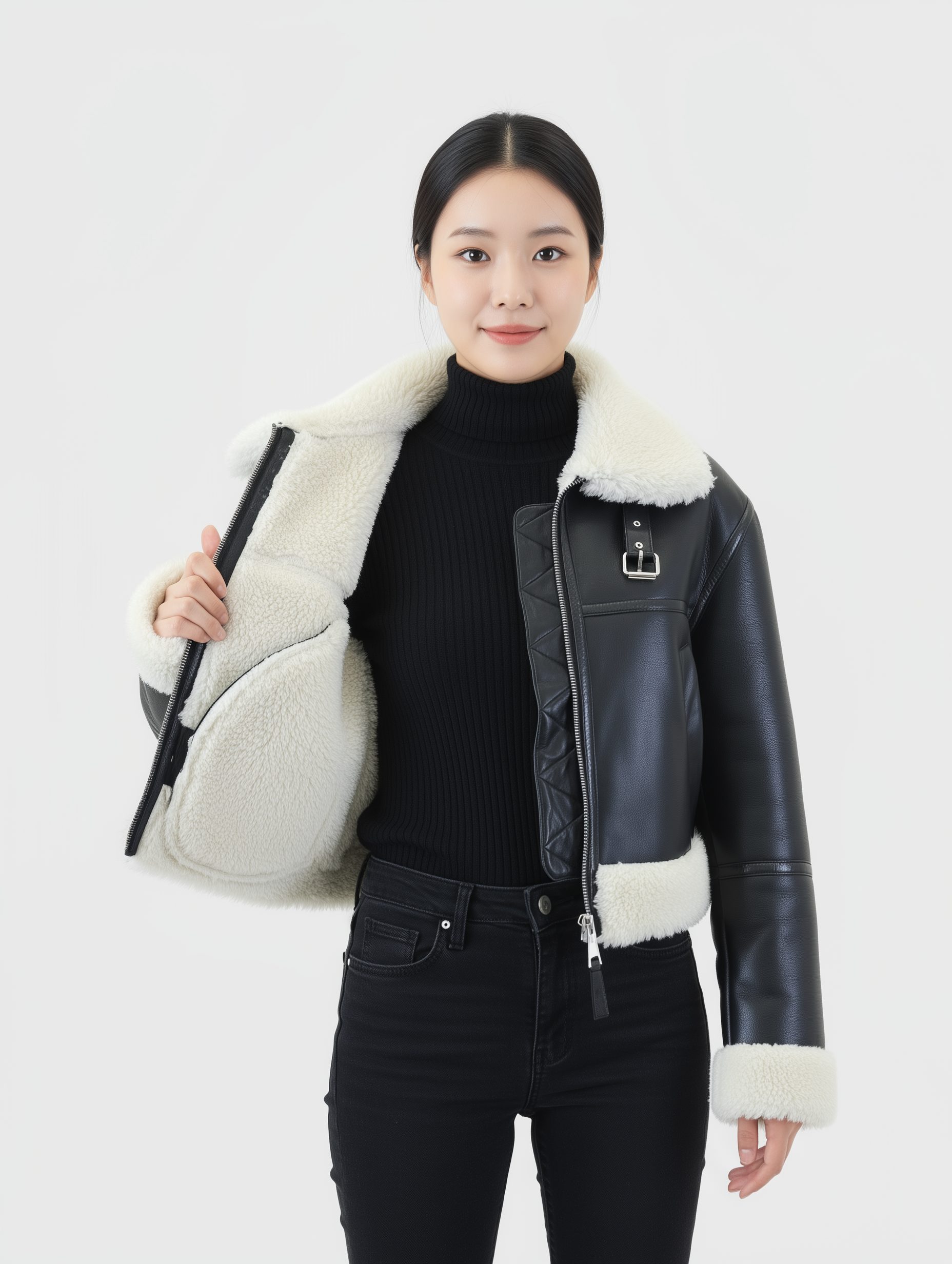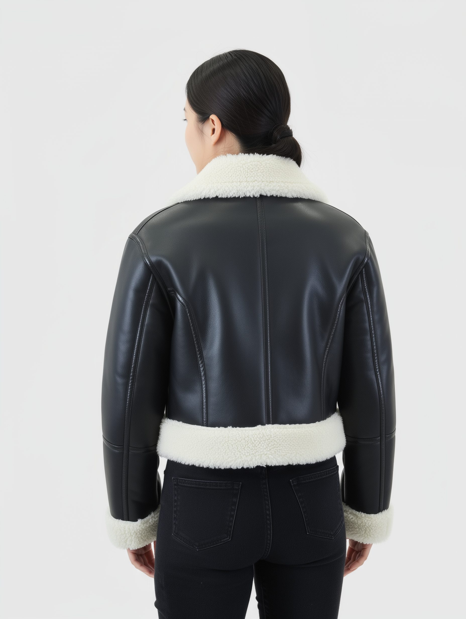 เสื้อหนังแท้สีดำบุขน ทรงครอป